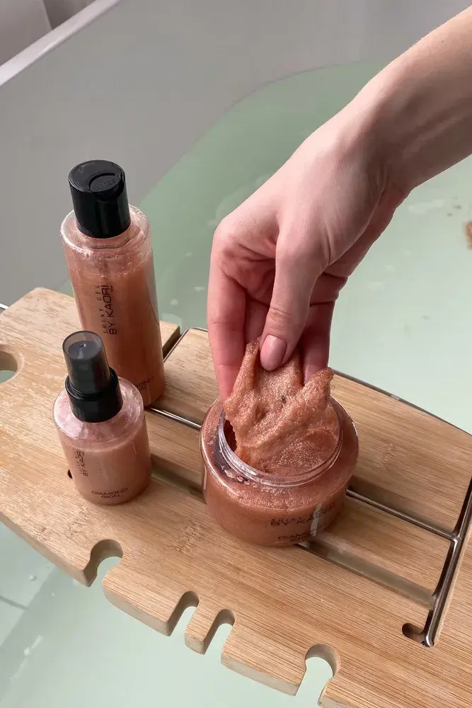 Наносите скраб на тело, избегая области лица и особо деликатных участков кожи.