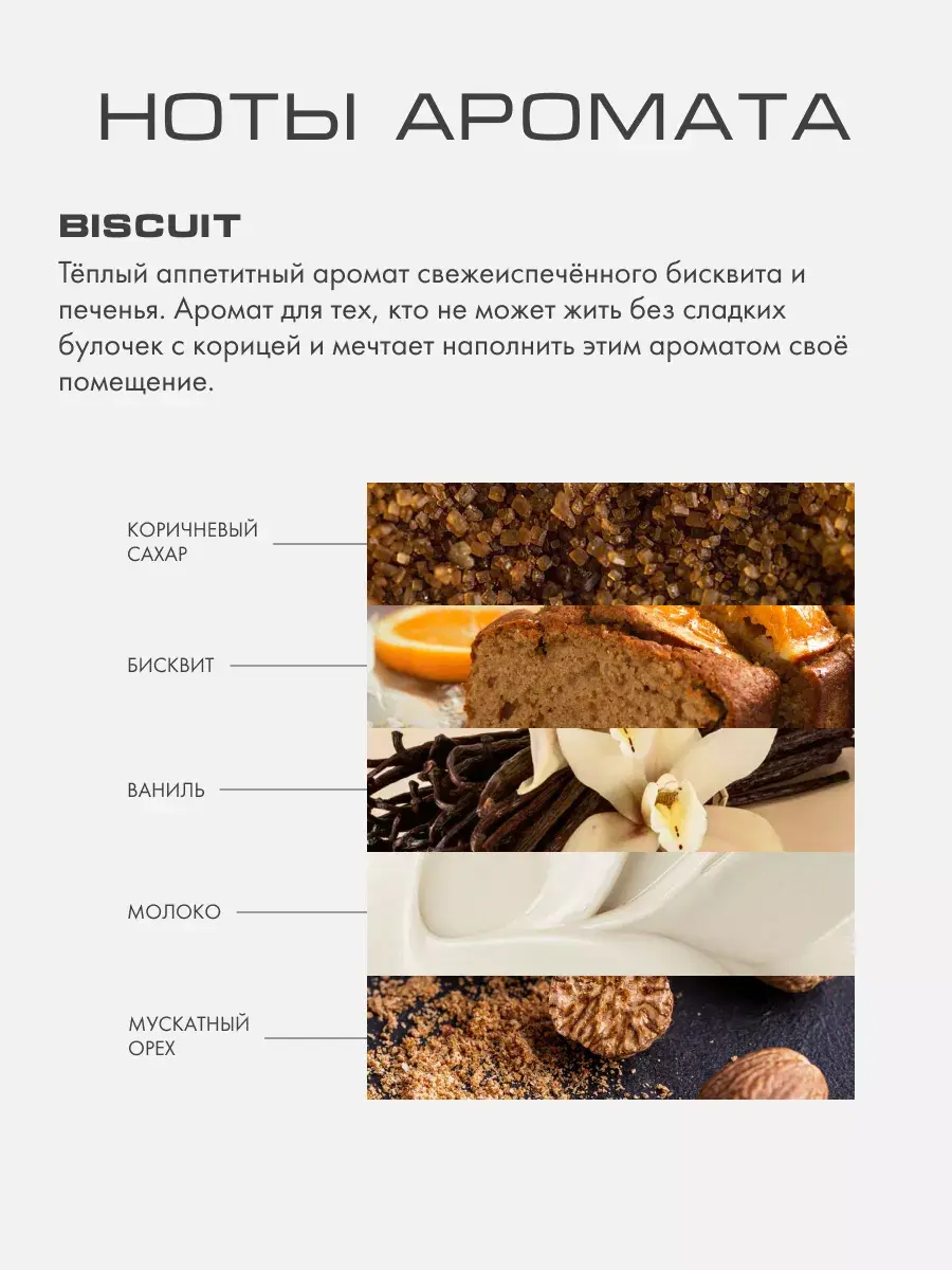 BISCUIT - аромат для тех, кто не может жить без сладких булочек с корицей и мечтает наполнить этим ароматом своё помещение.